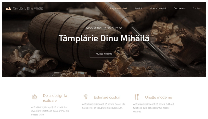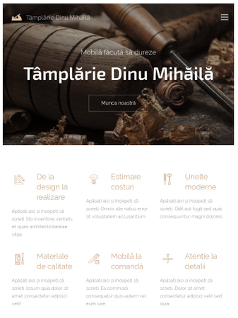 Cu acest șablon puteți crea site-ul perfect pentru afacerea dvs. bazată pe activități de tâmplărie. Culorile în nuanțe de lemn și iconițele atractive vor complimenta galeriile de imagini care vă prezintă munca. Testimonialele de la clienții mulțumiți și un număr de telefon vizibil vor invita vizitatorii site-ului să vă contacteze. Acest șablon prezintă toate aspectele de care un profesionist ar putea avea nevoie.